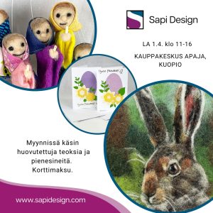 Sapi Design saapuu Kauppakeskus Apajaan esittelemään ja myymään käsin huovutettuja teoksia sekä pienesineitä PE 17.3. klo 11-18 ja LA 18.3. klo 10-17.
